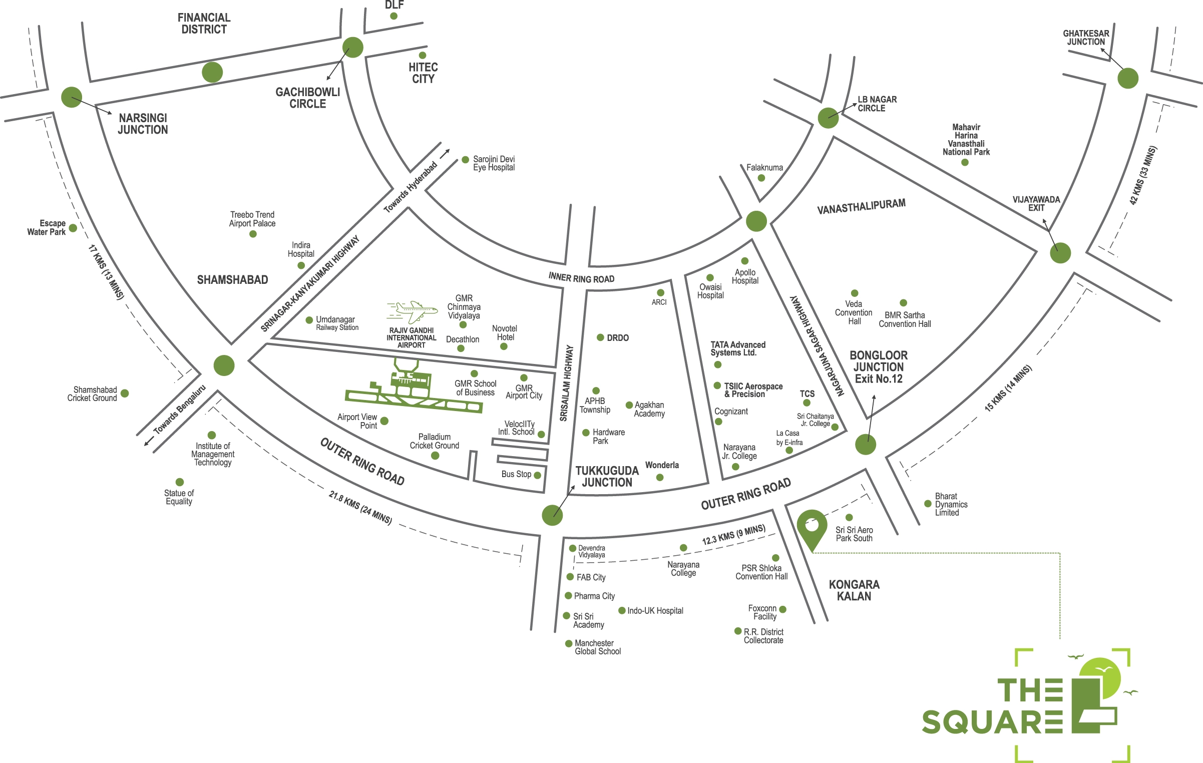 IRA The Square enjoys exceptional proximity to Hyderabad's major employment and travel hubs. The Rajiv Gandhi International Airport is approximately 19 km away — just a 15-minute drive. TCS Adibatla, one of South Hyderabad's largest IT campuses, is a short 10-minute drive. Fab City SEZ, Aerospace SEZ, and E-City are also in close vicinity, making The Square an ideal home for IT, aerospace, and aviation professionals. The Outer Ring Road further connects residents to Gachibowli, Financial District, and HITEC City.